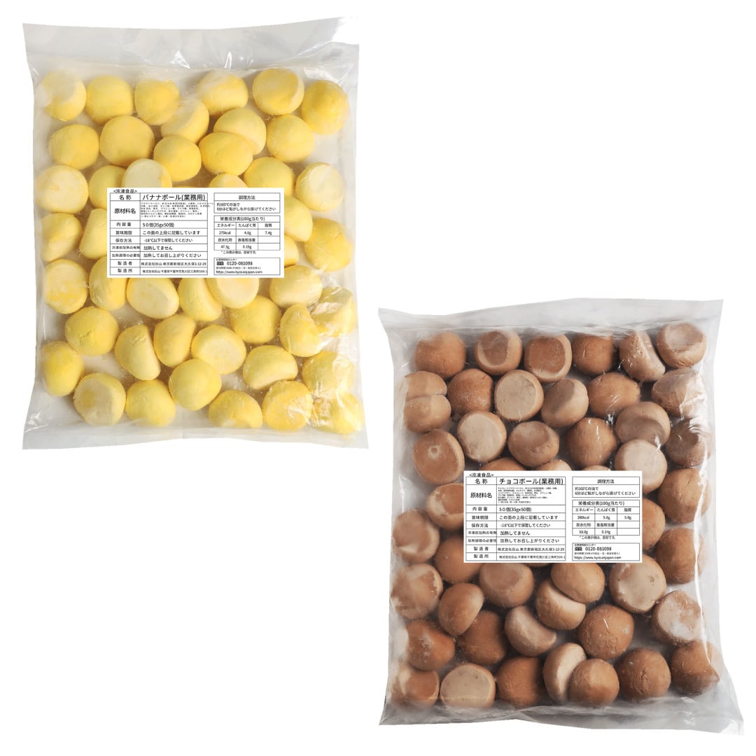 ジョンノョンノバナナボール チョコボールセット(チョコボール1、バナナボール1) 50個入り 2種類 100個 気軽く負担無しでメニュー投入で様々なバリエーション可能 165℃で6-7分揚げるだけで完成 揚げ出し商品は暑いのでやけどにご注意してください