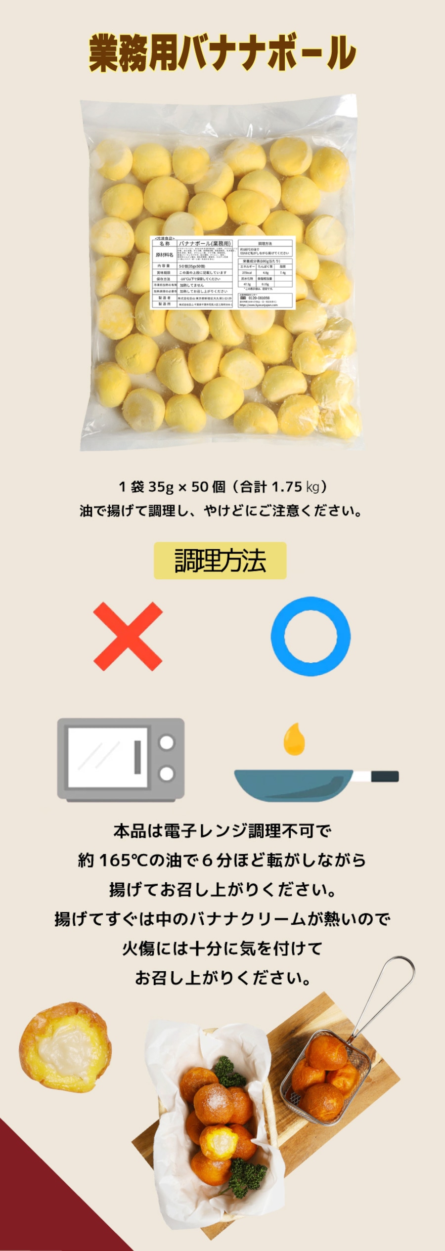 バナナボールは165℃で6-7分揚げるだけで完成 揚げ出し商品は暑いのでやけどにご注意してください