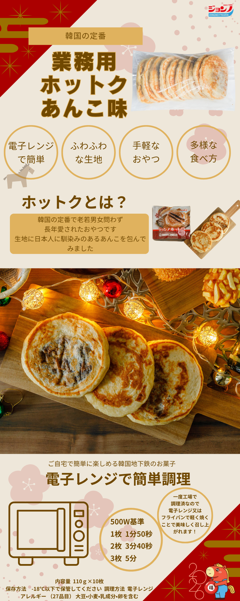 ジョンノホットクあんこ味・業務用(110g×40個入り)・新大久保・韓国グルメ・お得・大容量 冷凍食品 ホトック ハットグ 簡単調理 スイーツ 韓国食品・韓国商品